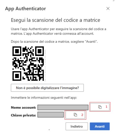 - Tornando sull’app Authenticator, selezionare come provider Microsoft Azure, copiare la stringa Nome account nel campo Etichetta e la stringa Chiave privata nel campo chiave segreta” quindi premere Creare un account. Per evitare errori, si suggerisce di copiare le stringhe Nome account e Chiave privata utilizzando le apposite icone copia evidenziate nell’immagine al punto 10 con i numeri 1 e 2 in rosso. A questo punto, nell’app Authenticator, sarà disponibile il nuovo account/collegamento appena creato.