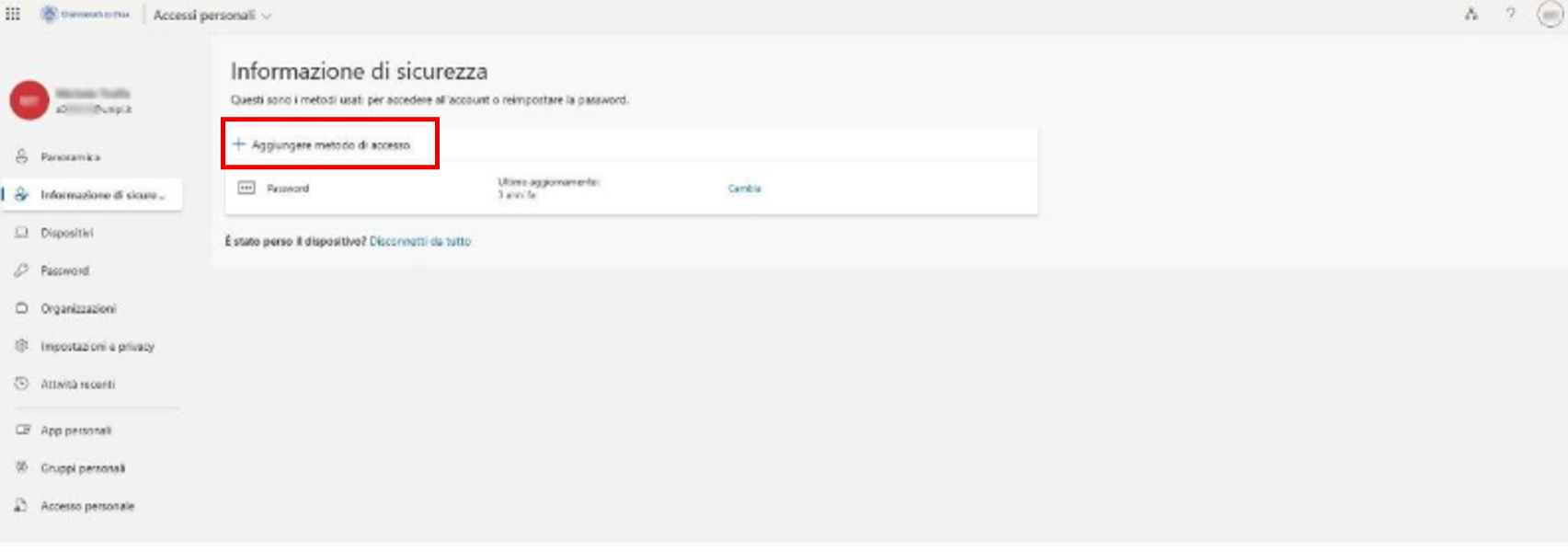 - Entrare nella sezione Account personale di Office 365 dall’indirizzo: https://myaccount.microsoft.com/ (se richiesto, procedere all’autenticazione canonica).