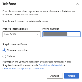 - Inserire il country code italiano (+39) e nel campo Phone number il numero del proprio smartphone. Cliccare su Ricevere un codice (o mantenere la selezione se l’opzione è già evidenziata). Quindi cliccare su Avanti.