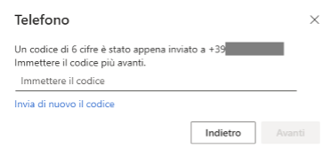 - Per completare la procedura, Microsoft invierà un SMS al numero di cellulare indicato al punto 5 e sarà necessario inserire il codice presente nell’SMS nell’apposito campo Immettere il codice.